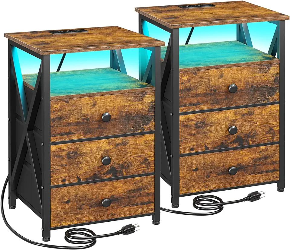 AMHANCIBLE Night Stand Set 2, LED Nightstand with Charging Station, End Side Tables with USB Port & Outlet, Bedside Tables with Fabric Drawers for Bedroom Living Room, Rustic Brown HET053LBR