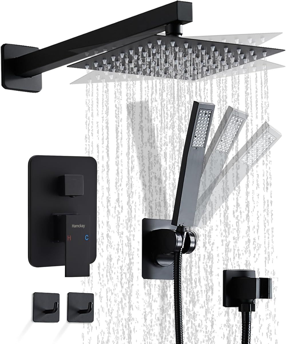 12 Inch Matte Black Shower Faucet Set with Square Rain Shower Head and Handheld Spray, Wall Mounted Rainfall Shower Head with Handheld Combo, Bathroom luxury Shower System with Valve and Trim
