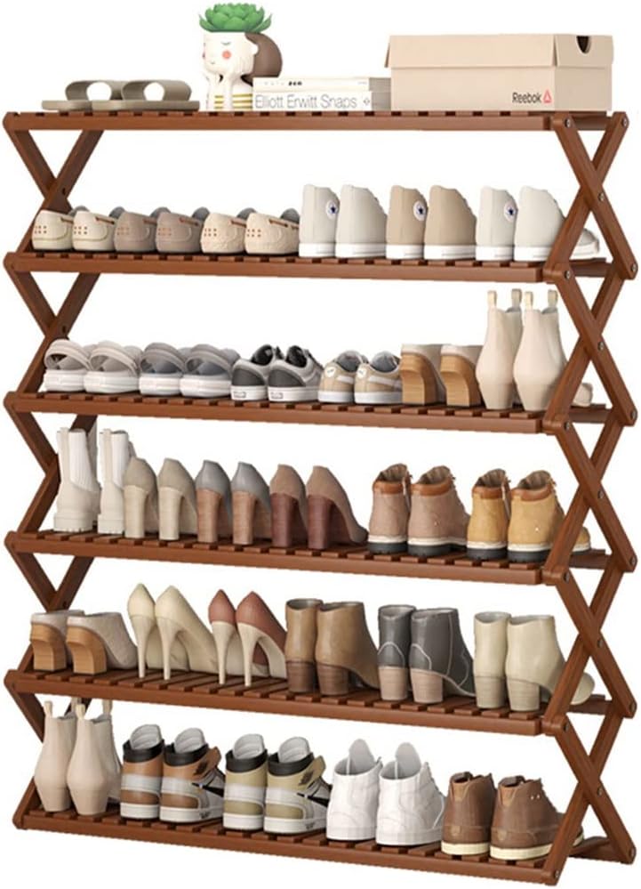 6 Tier Free Standing Shoe Shelf Foldable Bamboo Shoe Rack Entryway Storage Organizer for Hallway Bathroom Living Room Bedroom, Balcony (Color : Wood, Size : 50 * 25 * 110cm)