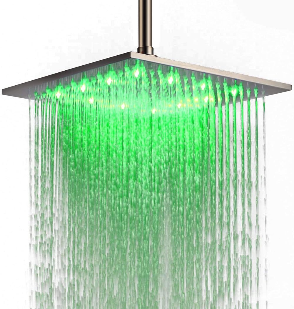 Luxury Led Light Shower Head Waterfall Bathroom 12 Inch Large Square Top Sprayer Stainless Steel Rainfall High Pressure Ceiling Shower Head Adjustable Brushed Nickel