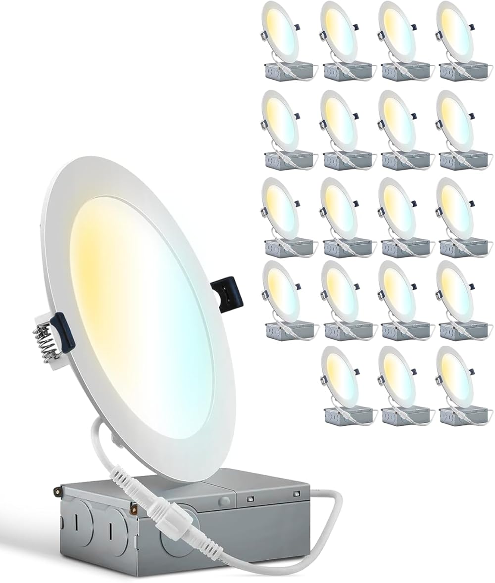 20 Pack 4 Inch 5CCT Ultra-Thin LED Recessed Ceiling Light with Junction Box, 2700K/3000K/4000K/5000K/6000K, 9W, 750LM High Brightness LED Can Light- ETL and Energy Star Certified