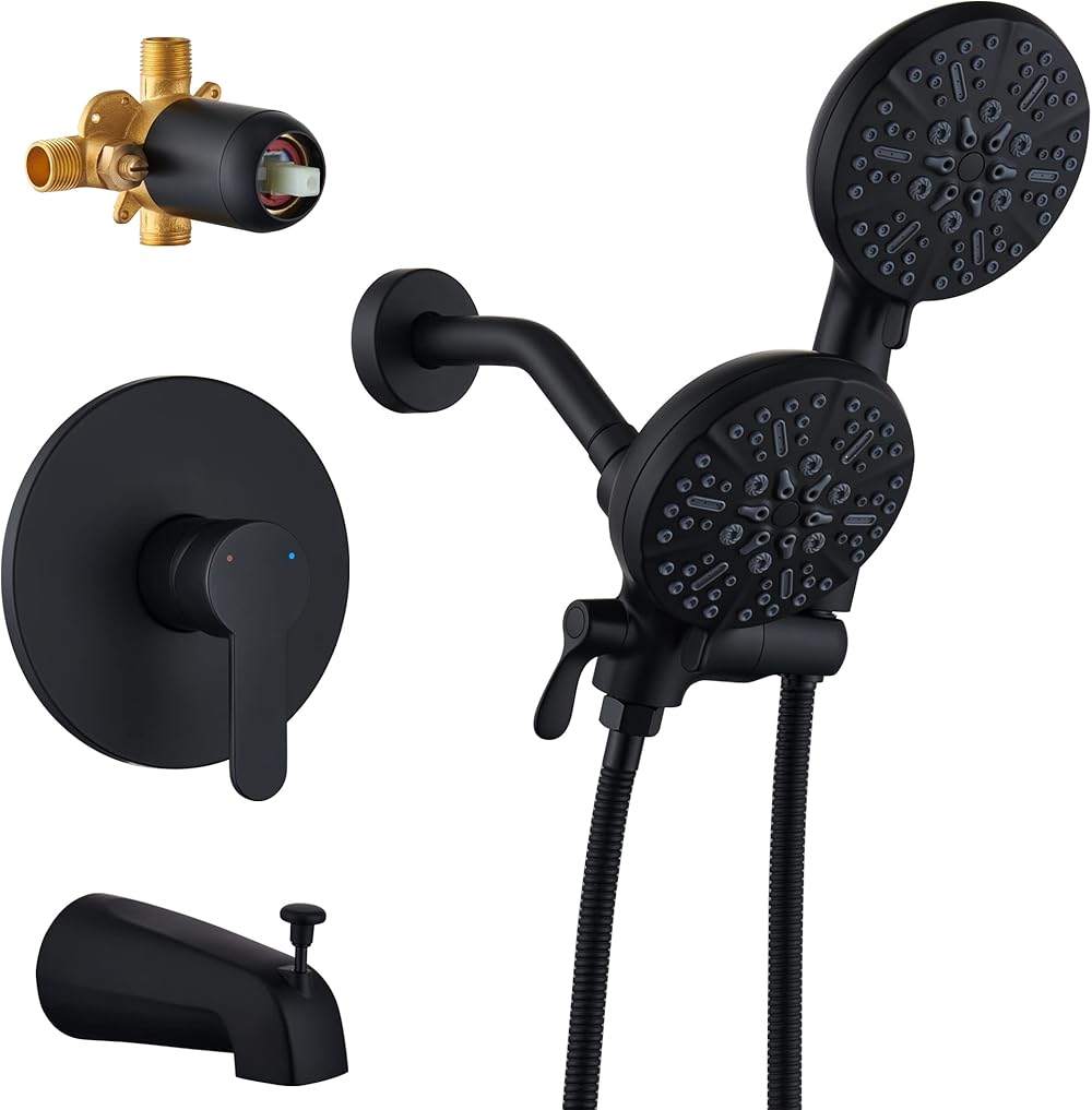 Black Shower Faucet Set with Tub Spout, 48-Setting Dual Shower Head and Faucet Sets Complete, 3-Way Diverter Tub and Shower Faucet Combo, Single Handle Tub and Shower Trim Kit (Valve Included)