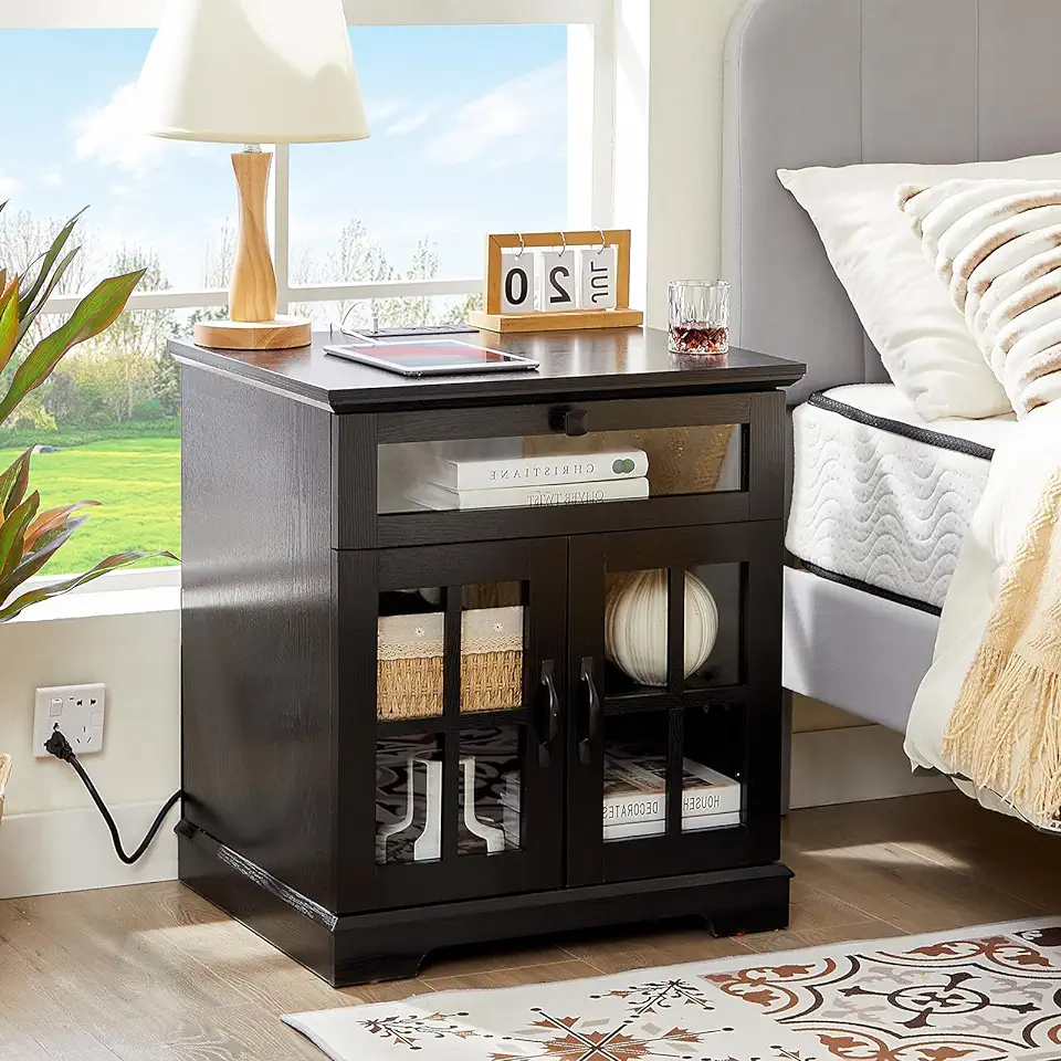 NONGSHIM Farmhouse End Table with Drawer, 24" Large Sofa Side Table with Charging Station, Glass Barn Door, Rustic Wood Nightstand, Bedside Table for Living Room, Bedroom, Office, Black
