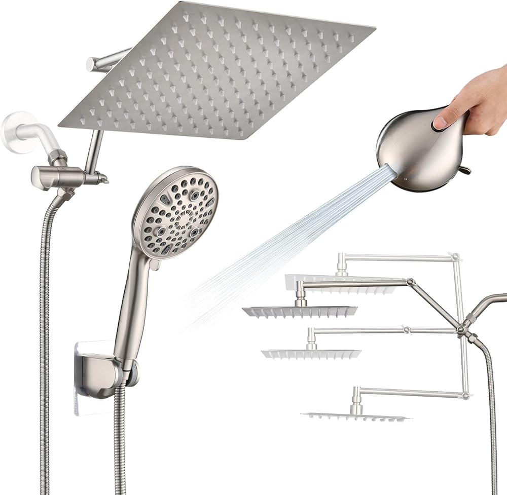 Hibbent All Metal 12'' Dual Filtered Rainfall Shower Head Combo, High Pressure Handheld Shower Head with 12'' Adjustable Curved Extension Arm, 20 Stage Shower Filter, 10-spray, 71'' Hose, Chrome