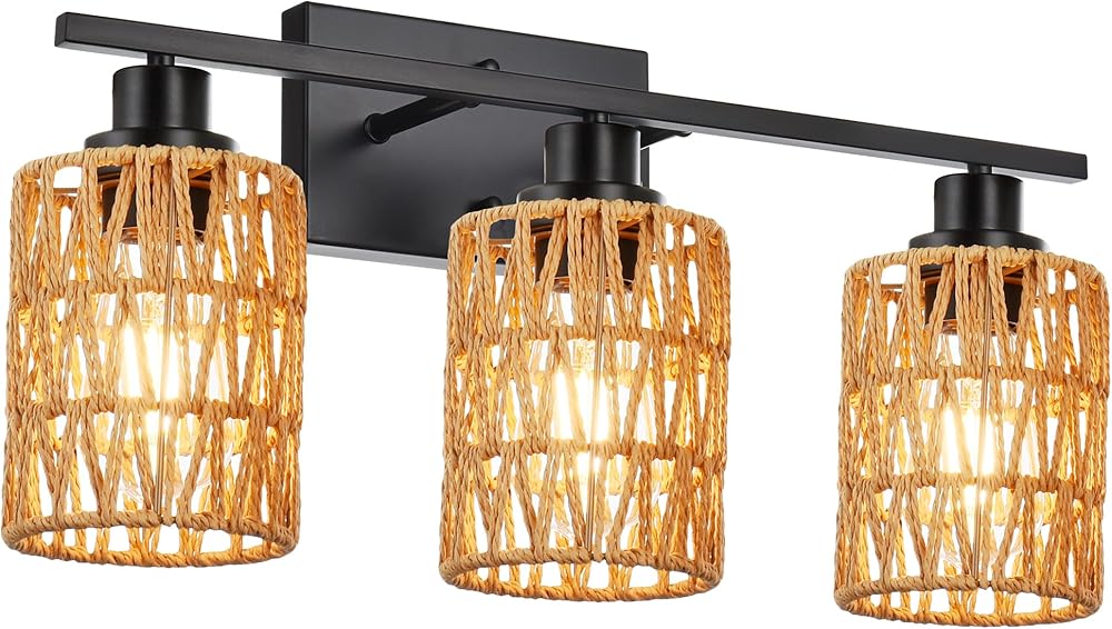 MELUCEE 3 Light Bathroom Vanity Light Rattan Wall Sconce 24 Inches Farmhouse Bathroom Light Fixtures with Ratten Lamp Shade, Black Finish, Suitable for Kitchen Hallway Living Room