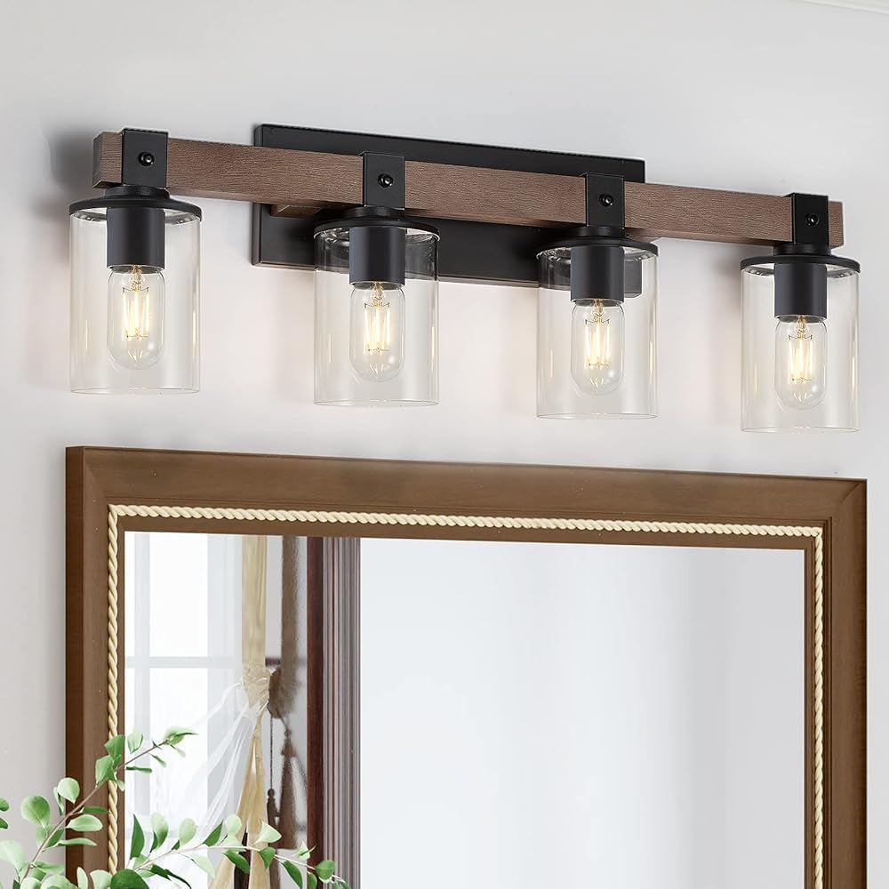DUJAHMLAND 4 Light Wood Farmhouse,Rustic Bathroom Light Fixtures with Clear Glass Shade, Vanity Lights for Bathroom Over Mirror Sconces Wall Lighting (Wood)
