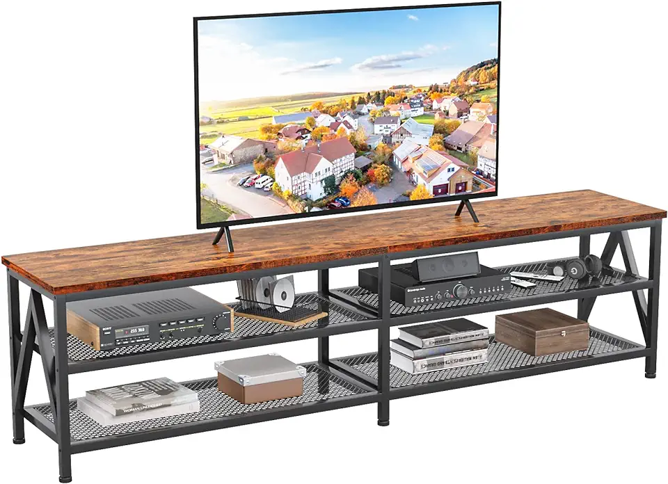 Furologee TV Stand for 75 80 inch TV, Extra Long 71" Entertainment Center, Industrial TV Console Table with 3 Tiers Open Storage Shelves for Living Room, Bedroom, Rustic Brown
