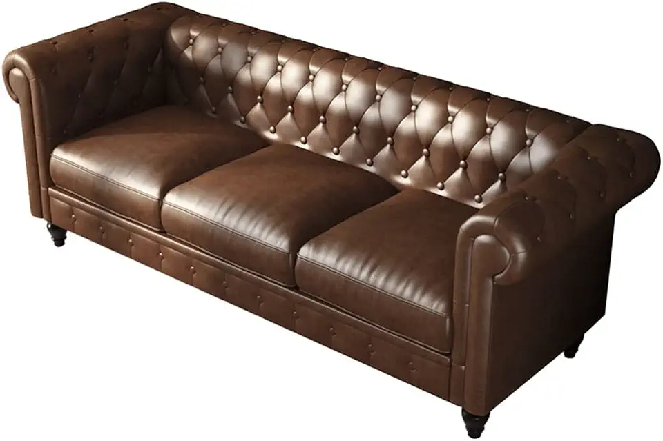 88 inch PU Sofa with Rolled arms, Cognac Brown, Dark Brown Solid Wood Frame, Suitable for Living Room and Bedroom