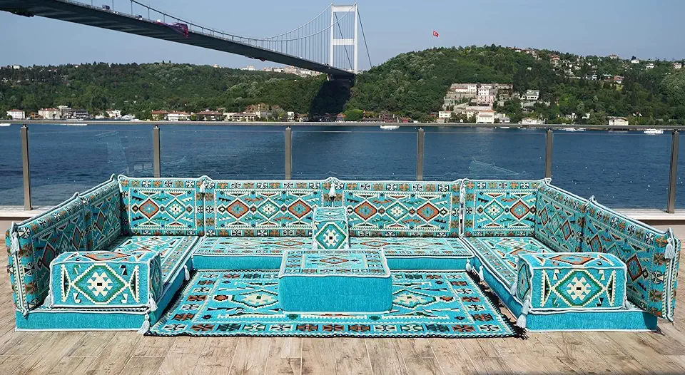 Light Blue Corner Floor Sofa Seating Set, U Shaped Arabic Sofa Set, Oriental Floor Seating, Floor Cushions, Living Room Sofa, Arabic Majlis,Floor Couch (U Sofa + Rug + Ottoman)