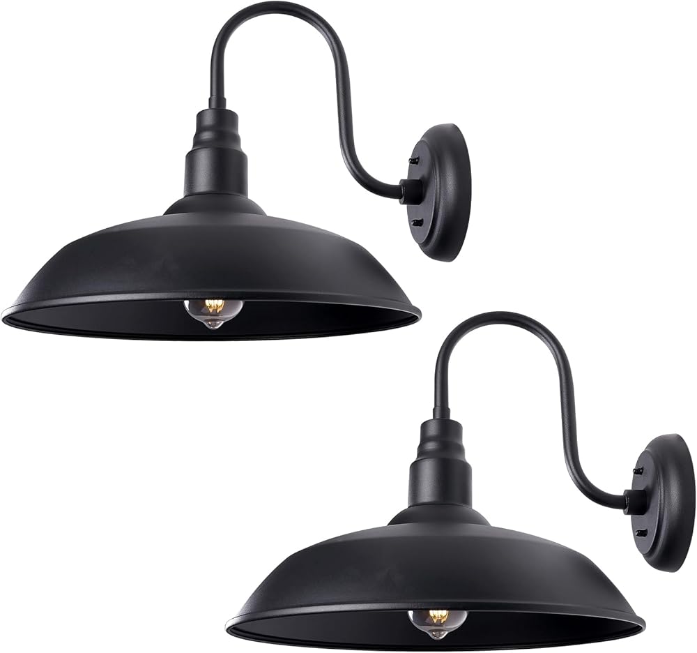 16" Gooseneck Light Fixture for Barn Door, 2 Pack Large Barn Light for Front Porch, Black Outdoor Farmhouse Light with Goose Neck Arm, Exterior Wall Dome Light for House Garage