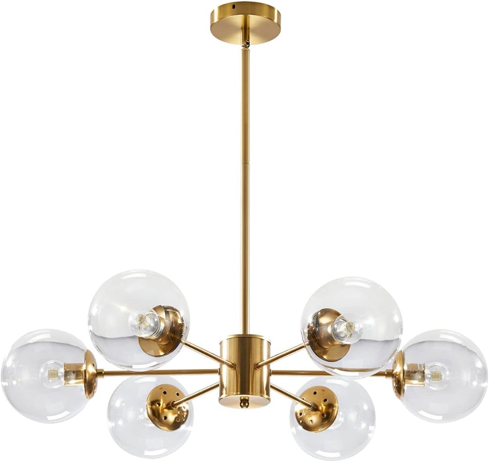 KCO Lighting Modern 6-Light Sputnik Chandelier with Clear Glass Globe Mid Century Adjustable Ceiling Pendant Light Gold Brass Flush Mounted Fixture