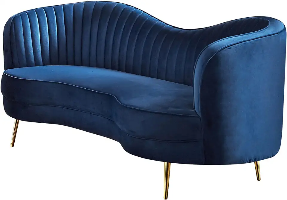 Benjara Chad 74 Inch Curved Loveseat, Channel Tufting and Camelback, Blue Velvet