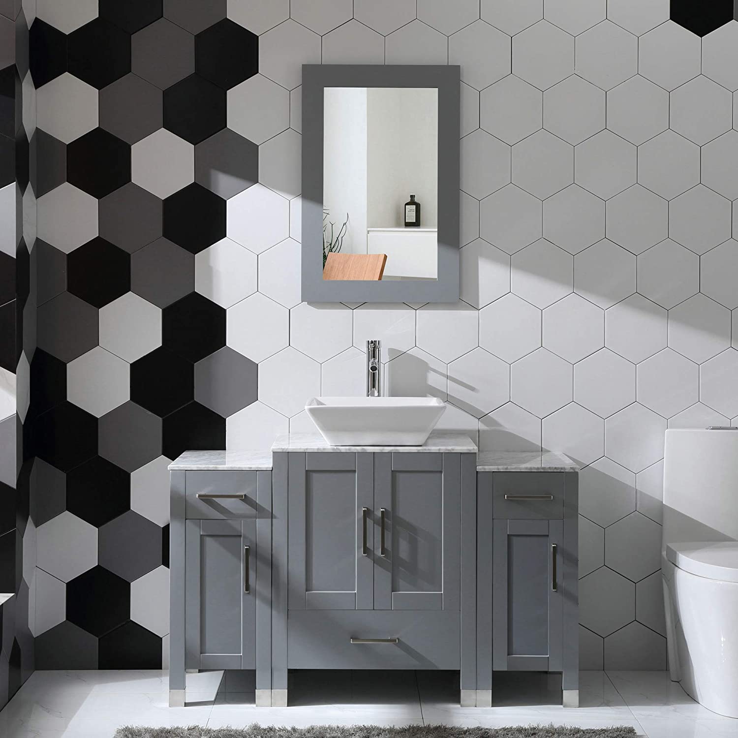 48" Bathroom Vanity Cabinet Solid Wood Marble Top w/Sink,Mirror,Faucet&Drain,Grey