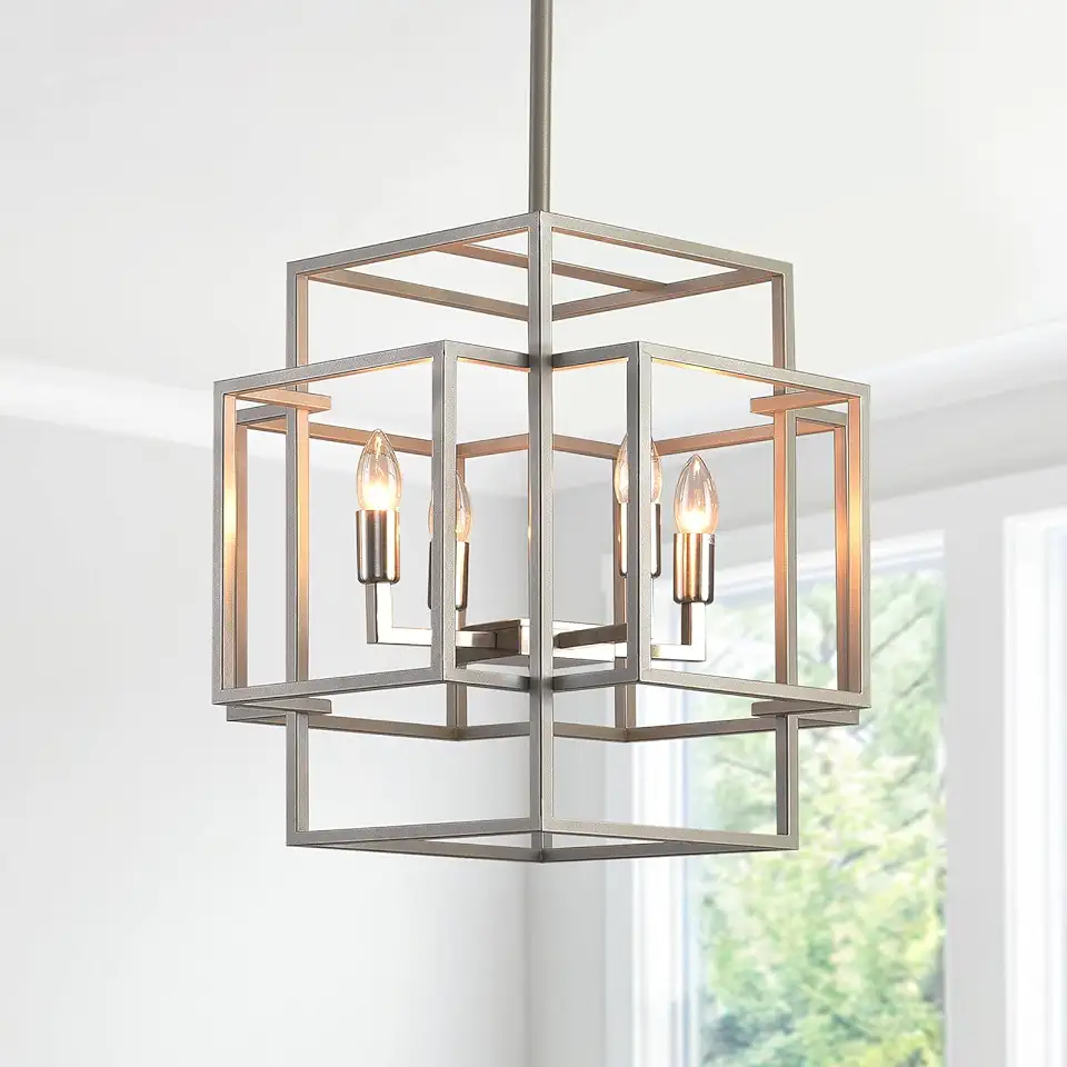 Modern Sliver Foyer Lantern Chandelier: 4-Light Farmhouse Rectangle Dining Room Light Fixtures Over Table Industrial Large Pendant Lighting High Ceiling for Entryway Kitchen Island Staircase Hallway