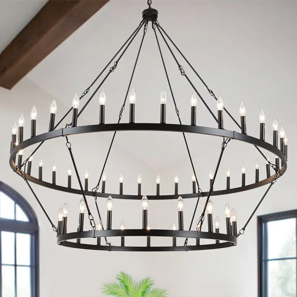 60 Inch Black Extra Large Wagon Wheel Chandelier, 2 Tier 54-Lights Farmhouse Chandeliers Industrial Round High Ceiling Pendant Light for Dining Room, Living Room,Entryway