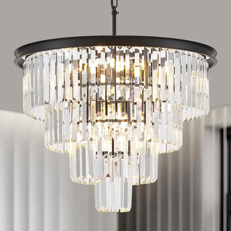 4-Tiers Modern Black Crystal Chandelier 12-Light 23.6" Crystal Pendant Chandeliers Light Fixture Crystal Hanging Lighting for Entryway Living Dining Room Bedroom Foyer High Ceiling