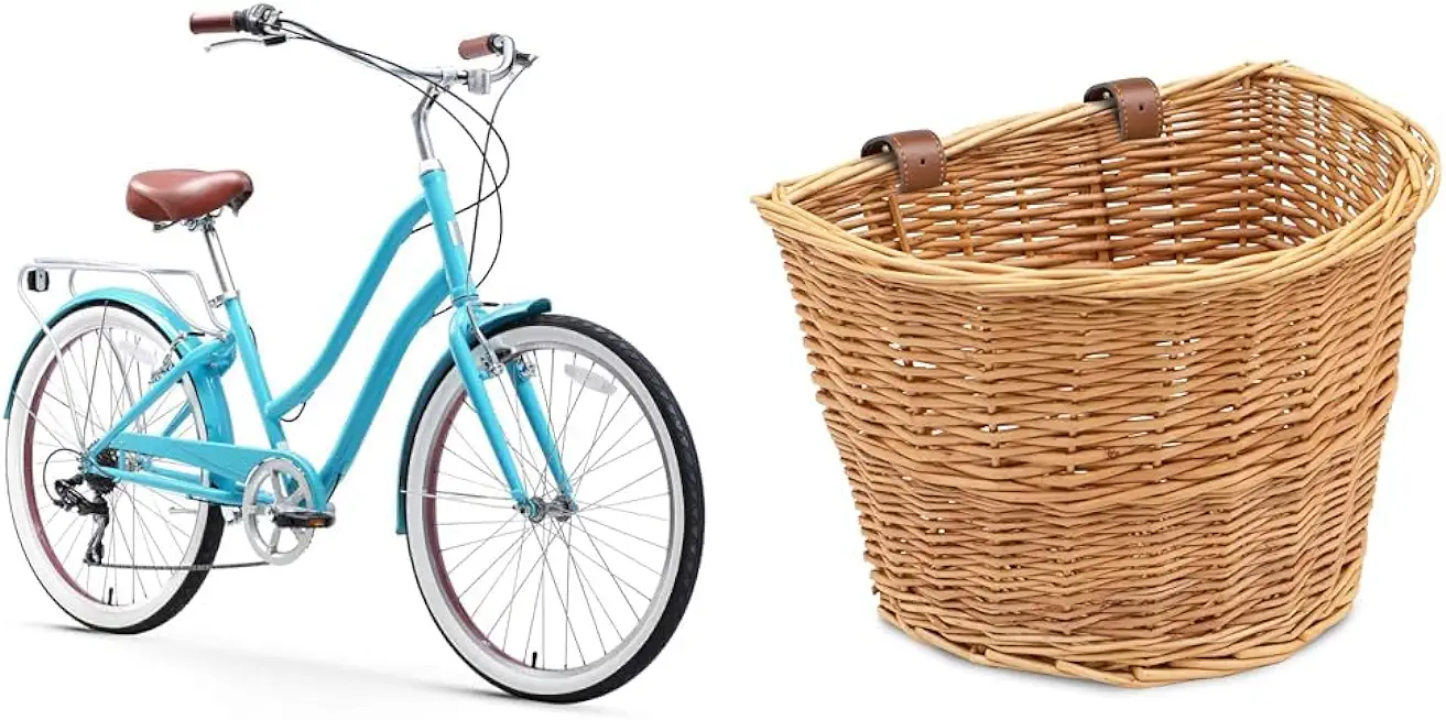 sixthreezero EVRYjourney Steel Women's 7-Speed 26" Hybrid Bike with ProsourceFit Wicker Front Cargo Basket for Cruiser and Comfort Bikes, Light Brown