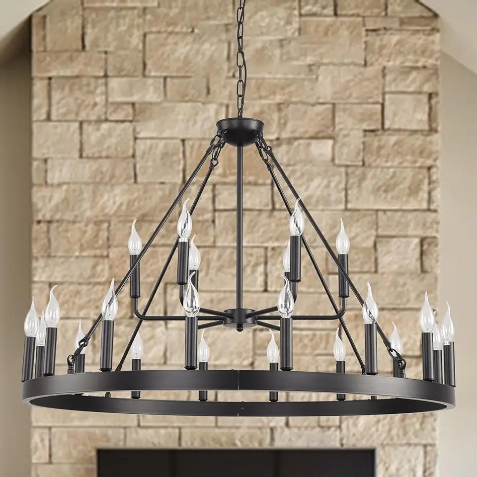 Wagon Wheel Chandelier for Dining Room 40inch-22light 2 Tier Large Farmhouse Pendant Light Fixtures, Round Modern Industry High Ceiling Chandelier (Black 2Tier 40inch 22-Lights A)