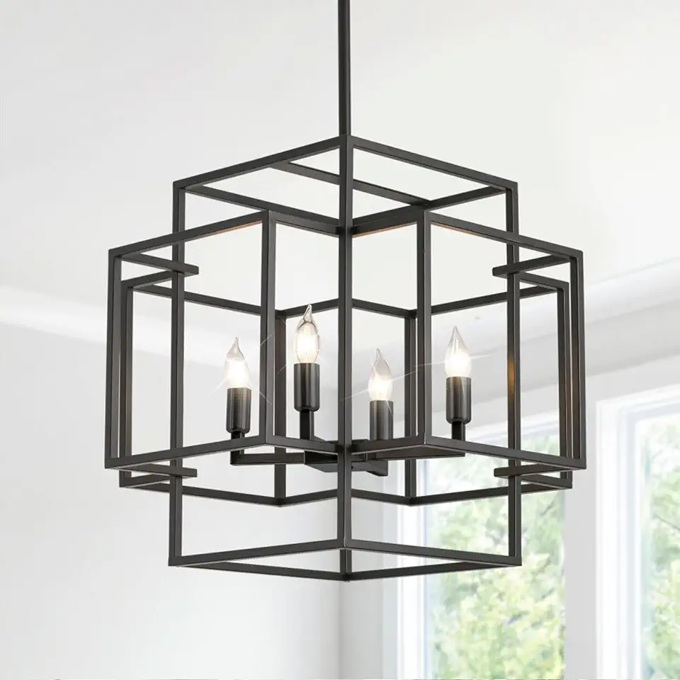 Black Farmhouse Chandelier Light Fixture: 4-Light Rustic Industrial Lantern Pendant Lighting Large Metal Cage Hanging Lights for Dining Room, Kitchen Island, Foyer, Entryway, Bedroom, Staircase