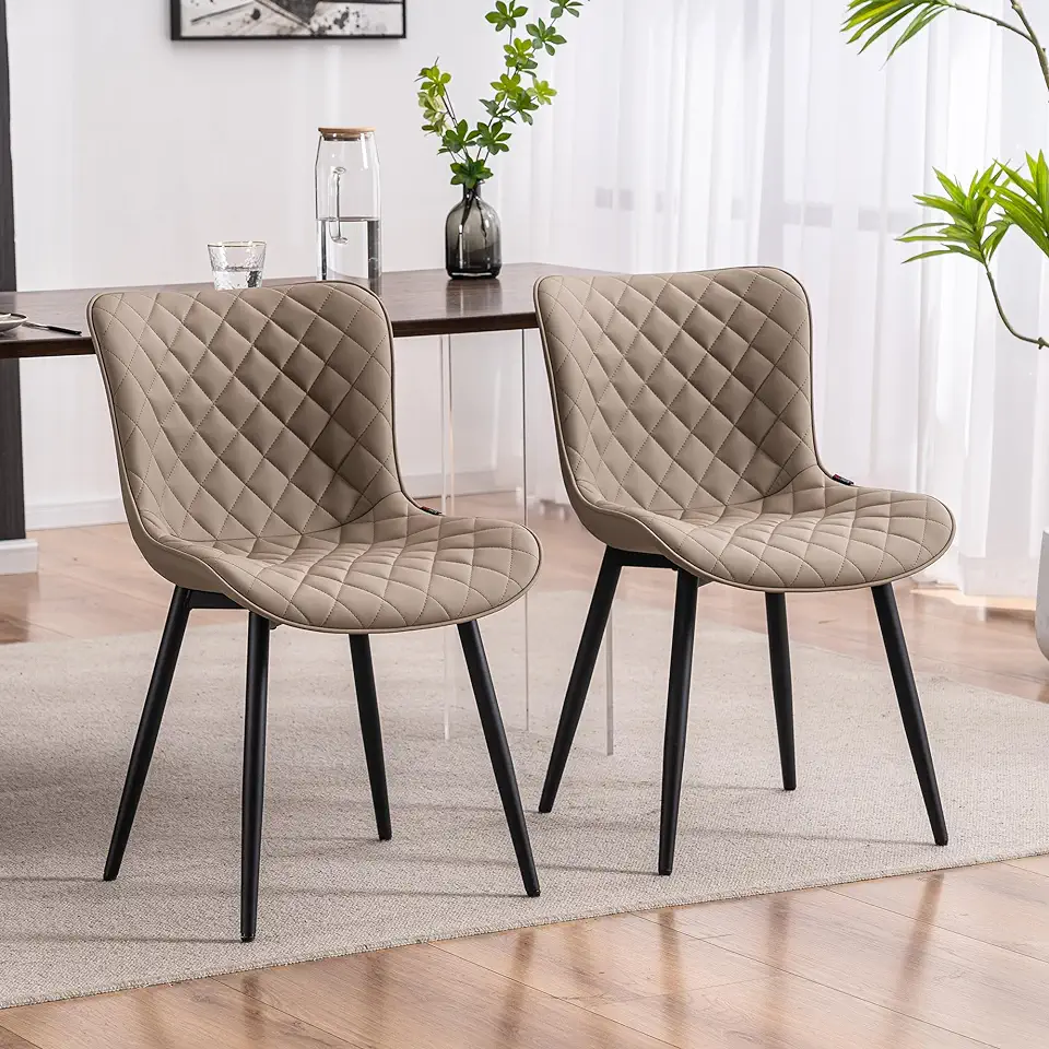 YOUTASTE Khaki Dining Chairs Set of 2 Mid Century Modern PU Leather Diamond Upholstered Accent Guest Dinner Chair with Back Metal Legs for Kitchen Living Reception Waiting Room