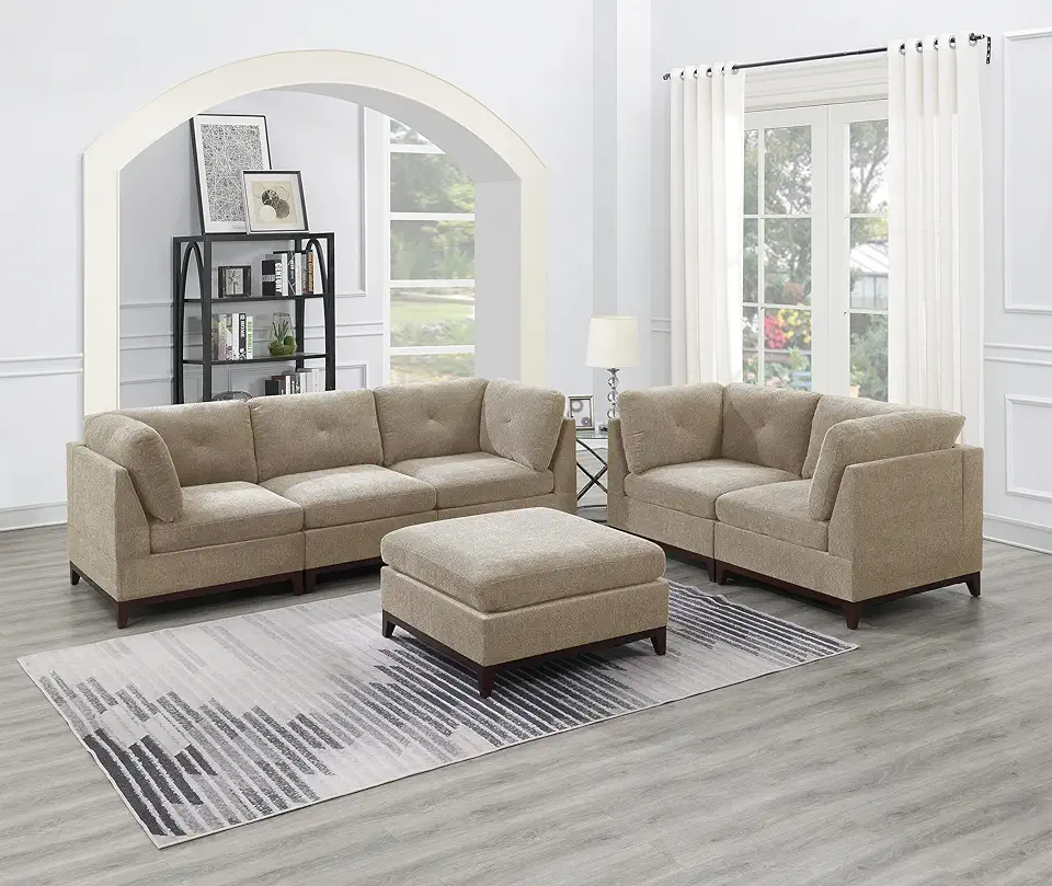 GOWE Camel Chenille Fabric Modular Sofa Set 6pc Set Living Room Furniture Couch Sofa Loveseat 4X Corner Wedge 1x Armless Chair and 1x Ottoman Tufted Back Exposed Wooden Base