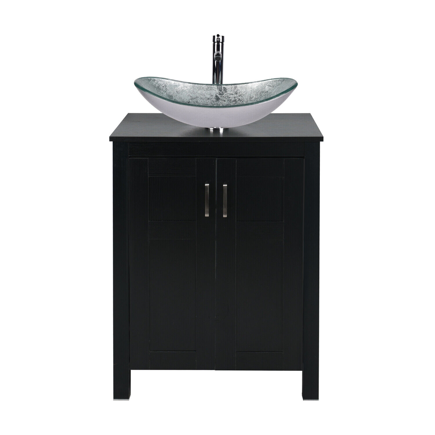 FULLWATT 24 Inches Traditional Bathroom Vanity Set in Black Finish, Single Bathroom Vanity with Top and 2-Door Cabinet, Brown Glass Sink Top with Single Faucet Hole