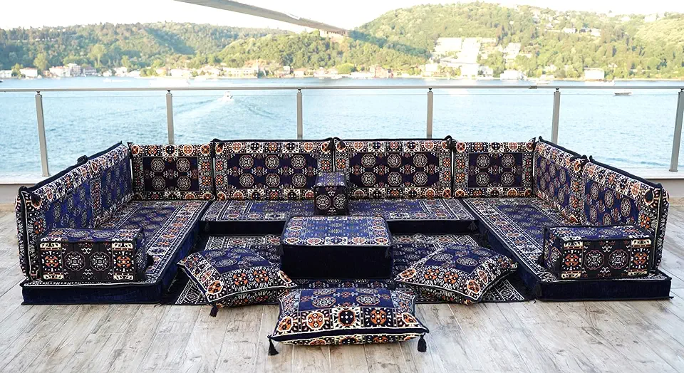 Navy Blue U Shaped Arabic Floor Sofa Set, Floor Cushions, Balcony Patio Sofas, Pallet Sofa, Ethnic Sofa, Moroccan Sofas, Sectional Sofas, Pouffs (U Sofa Full Set)