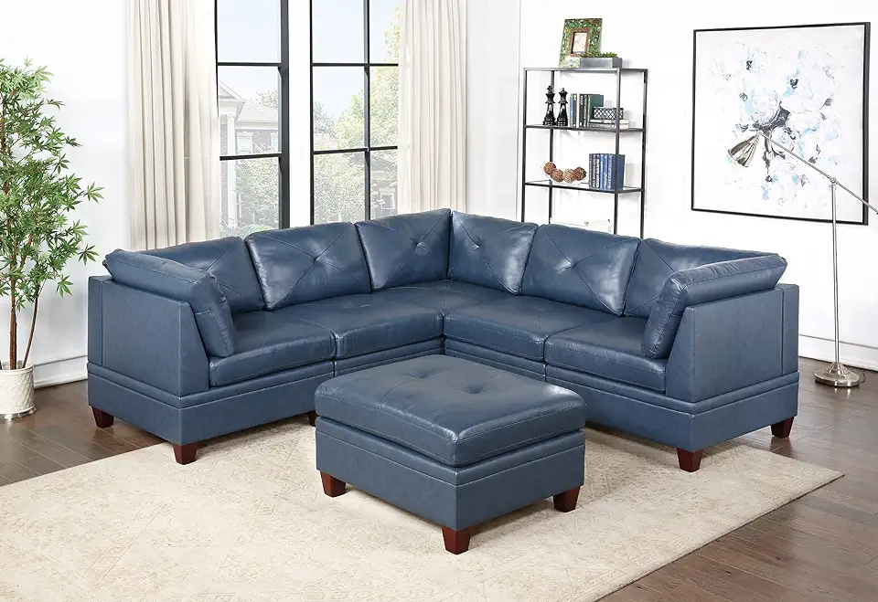 GOWE Genuine Leather Ink Blue Tufted 6pc Modular Sofa Set 3X Corner Wedge 2X Armless Chair 1x Ottoman Living Room Furniture Sofa Couch