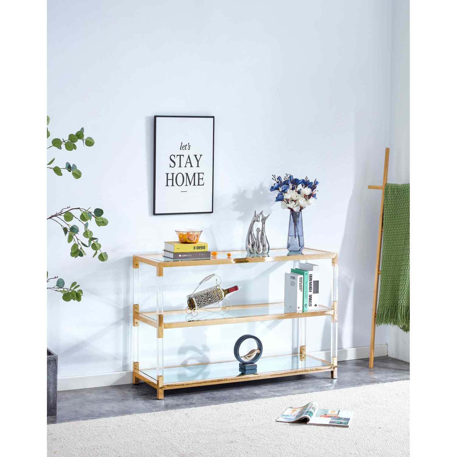 Golden Stainless Steel Console Table - Modern Sleek Design with Durable Structure - Stylish Living Room & Entryway Furniture - Clear Glass Top with Acrylic Touches