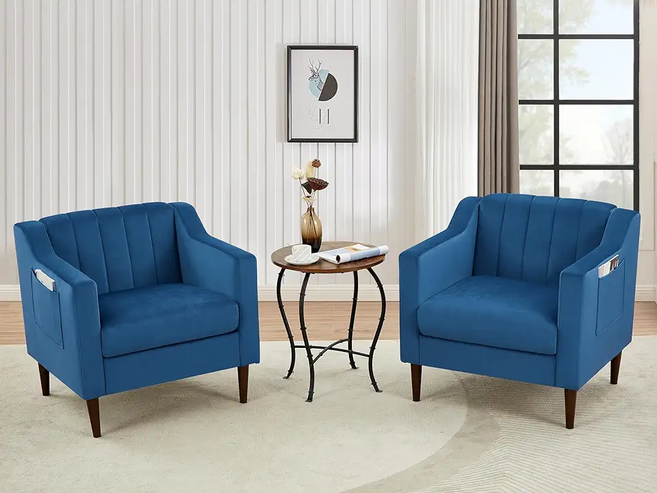 GOWE Chairs Set of 2, Mid Century Modern Armchair with Thick Cushion and Wood Frame, Comfy Reading Sofa Chair for Living Room Bedroom Office, Blue Velvet Fabric
