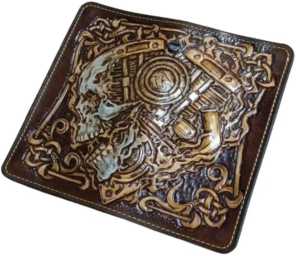 Men's 3D Genuine Leather Wallet, Long Travel wallet, Custom Biker wallet, Personalized Clutch wallet, V-twin Engine, Gearhead Design, Davidson Skull, Motorcycle, Sheridan Style Patterns, Harley, Bike