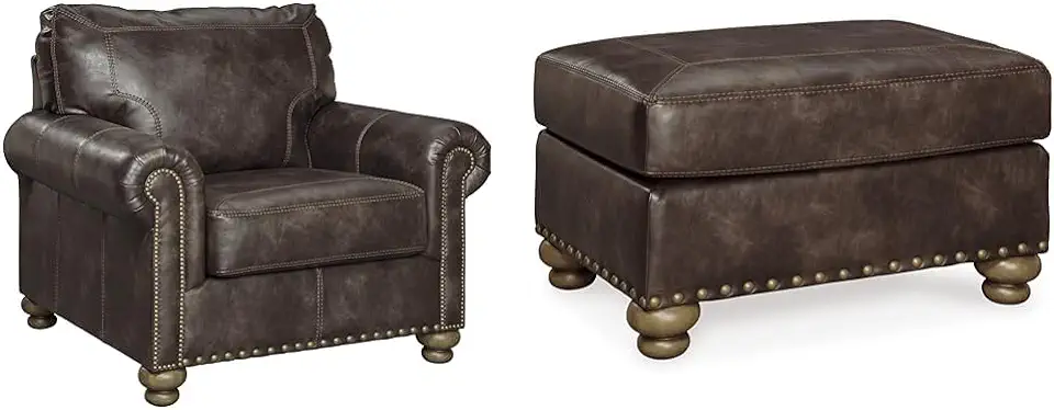 Ashley Nicorvo Traditional Faux Leather Chair & Ottoman Set with Gold Nailhead Trim, Brown