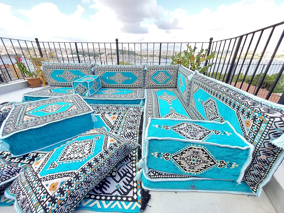 Light Blue Floor Cushions, Corner Sofa Set, Pallet Sofa, Arabic Majlis, Turkish Floor Seating Set, Backrest Pillows, Turkish Rug (L Sofas + Ottoman + Pillows)