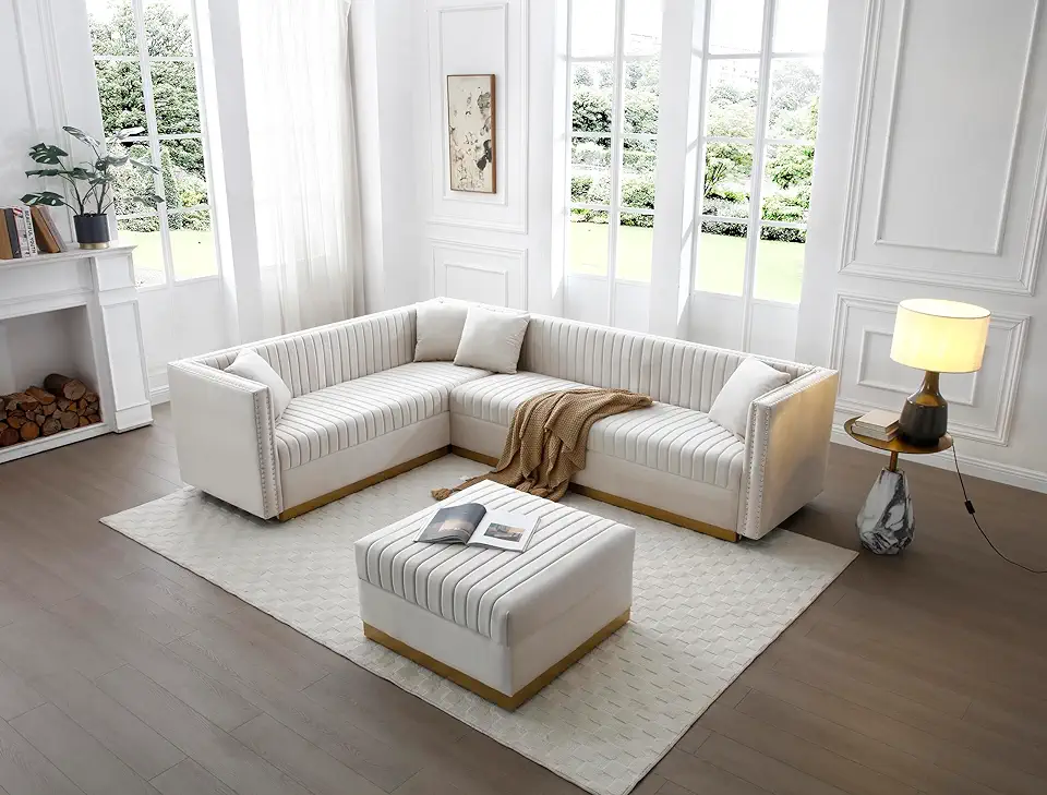 U Shaped Sectional Sofa with Reversible Ottoman & 4 Pillows, Modern Contemporary Vertical Channel Button Tufted Nailhead Decoration Velvet Upholstered Corner Couch for Living Room Apartment
