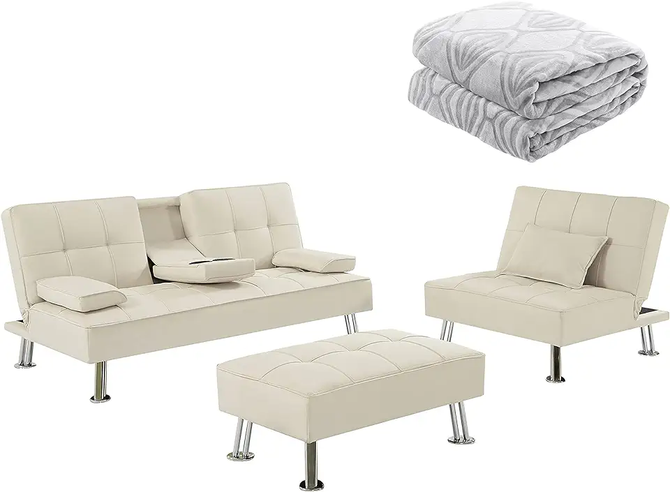 Convertible Fabric Folding Sofa Bed with 2 Cup Holders, Removable Armrest and Metal Legs, Single Sofabed with Ottoman, Daybed with Checked Sofa Blanket, 3 pcs for 1 Sets, Beige