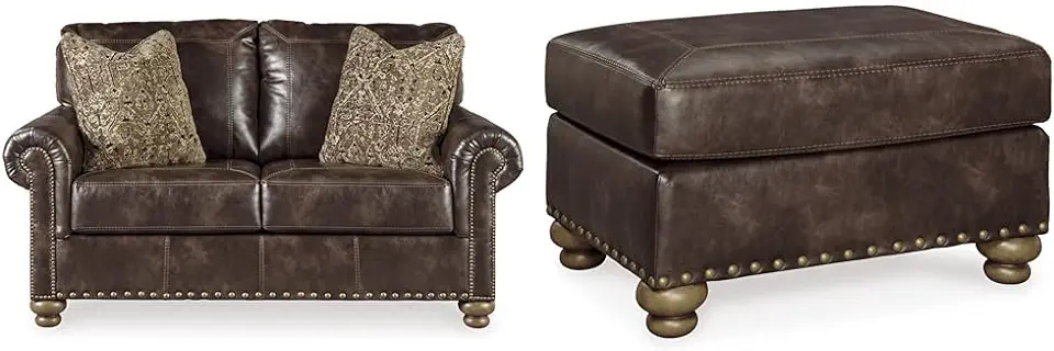 Ashley Nicorvo Vintagel Faux Leather Loveseat & Ottoman Set with Gold Nailhead Trim, Brown