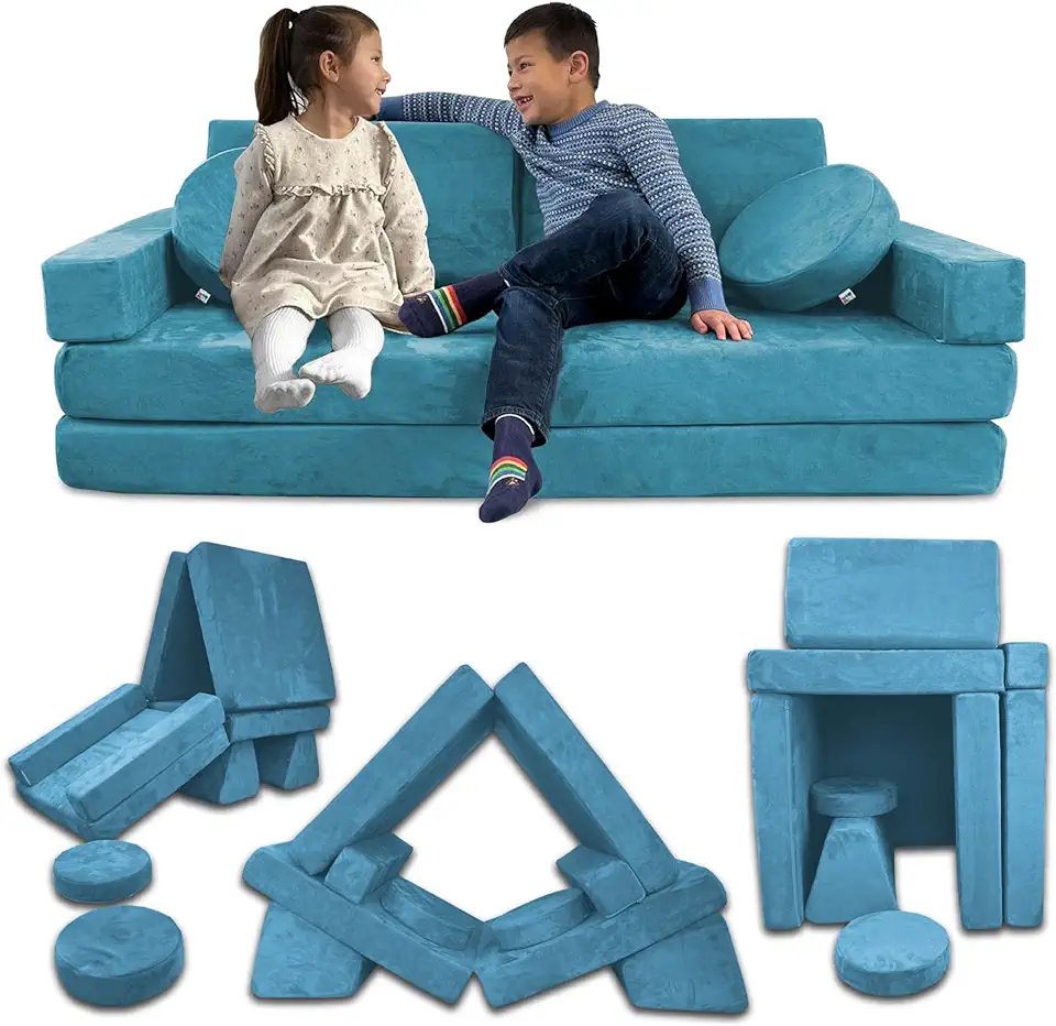 Mod Blox 10 Piece Soft Kids Modular Playset | Convertible Couch for Playroom with Microsuede Covers and High Density Foam Cushions (Turquoise)