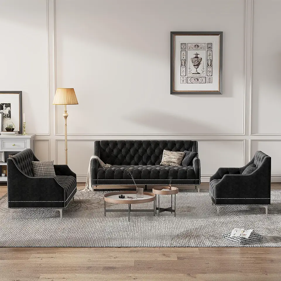 Chesterfield 3 Pieces Living Room Furniture Sets with Metal Legs, Buttoned Rivets Tufted Backrest, Frosted Velvet Upholstered Sectional Couch Include 3-Seater Sofa, Loveseat and Armchair, Black