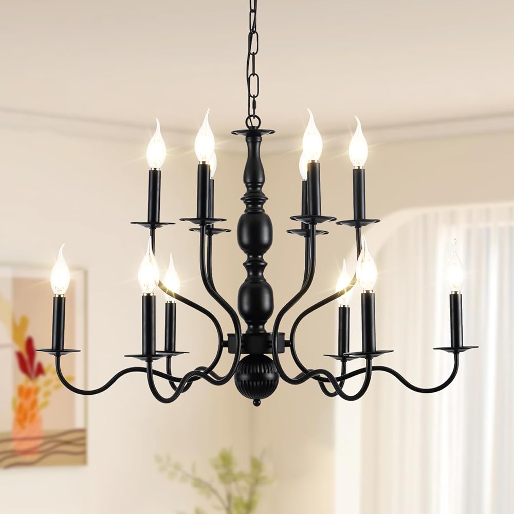 Black Chandelier, 12-Light Farmhouse Chandelier for Dining Room Lighting Fixtures Hanging, Candle Chandelier Industrial Pendant Ceiling Light fixture for Hallway Kitchen Foyer Living Room