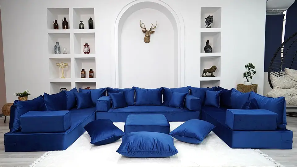 8" Thickness Royal Blue U Shaped Floor Seating Sofas, Sofa Bed Couch, Luxury Velvet Sofas, Moroccan Home Decor Livingroom Sofas, Arabic Seating Sofa (U Sofa + Ottoman + Pillows)