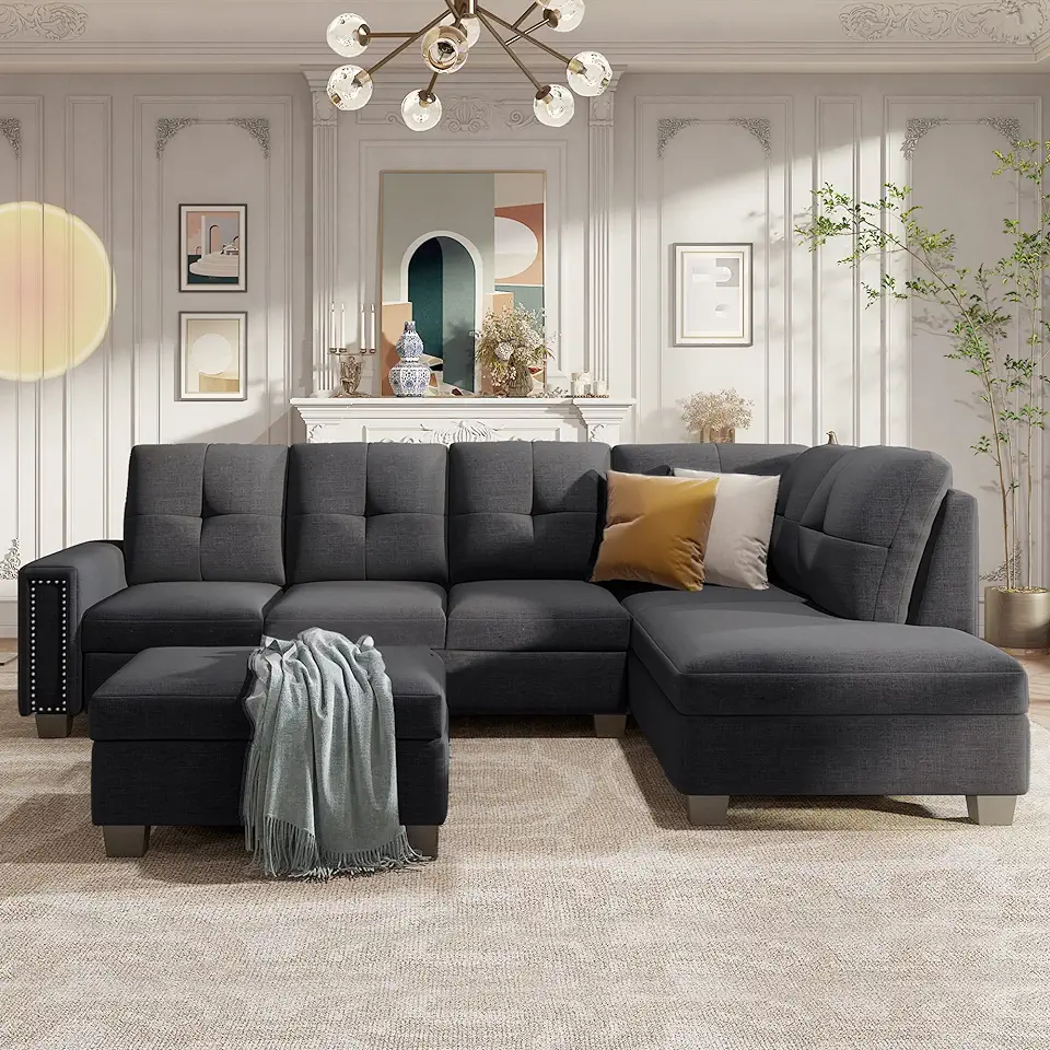 Reversible Sectional Sofa Saving with Storage Ottoman Rivet Ornament L-Shape Couch for Large Space Dorm Apartment, Gray