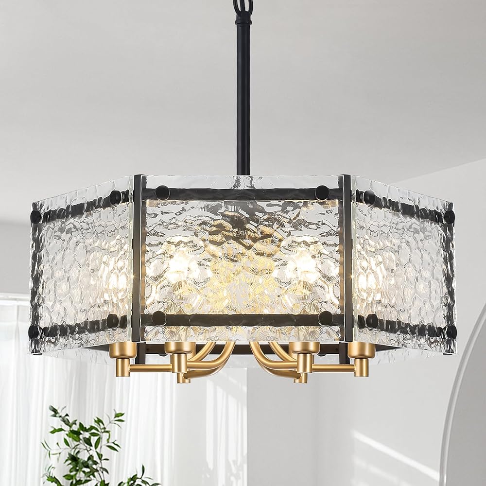 Luxury Water Ripple Glass Black Chandeliers for Dining Room 18.7" Textured Glass Modern Chandelier 6-Light Geometric Chandelier for Hallway Kitchen Island Living Room Bedroom