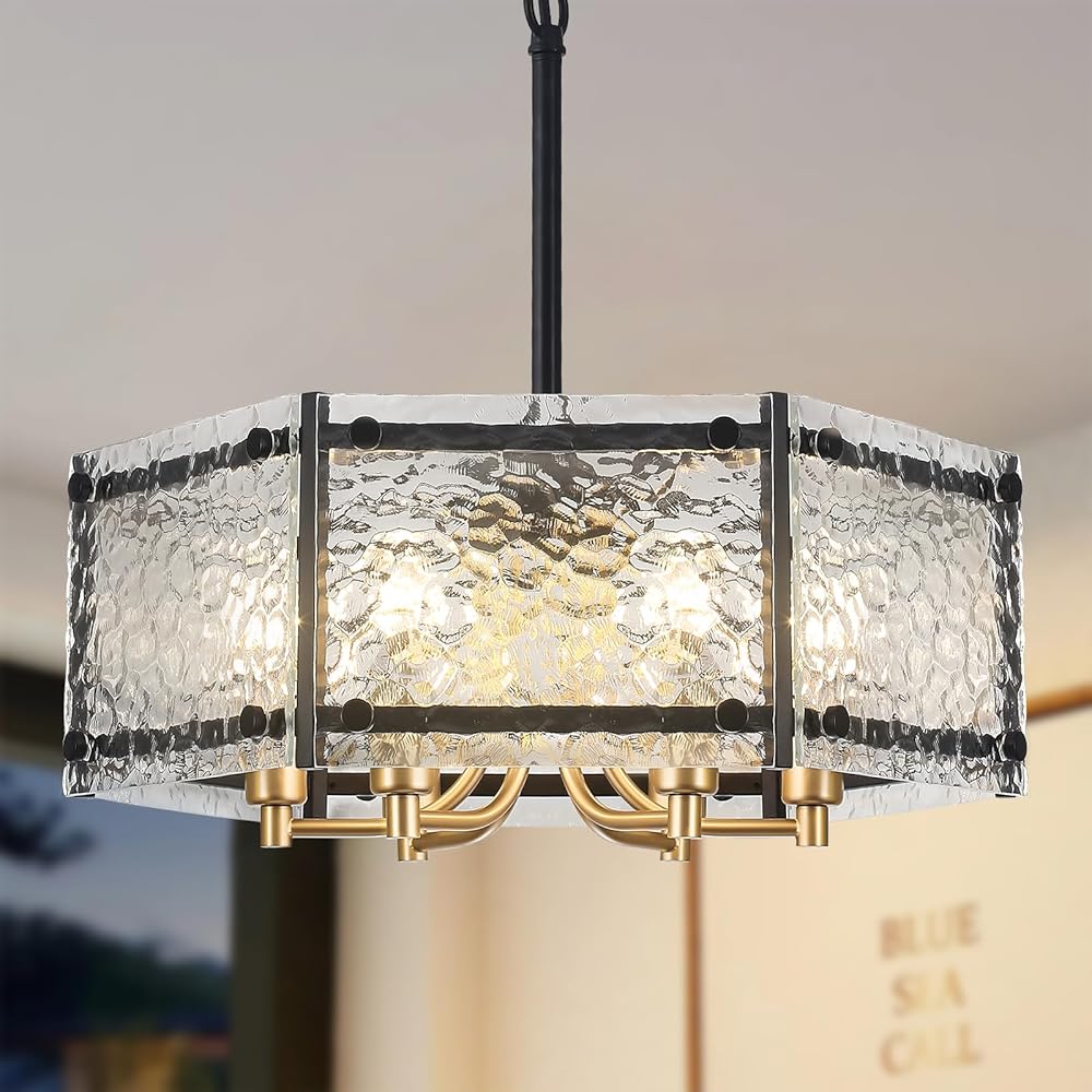 18.7" Modern Black Chandeliers for Dining Room 6-Light Luxury Water Ripple Glass Light Fixture Geometric Glass Chandelier for Kitchen Island Living Room Bedroom Hallway
