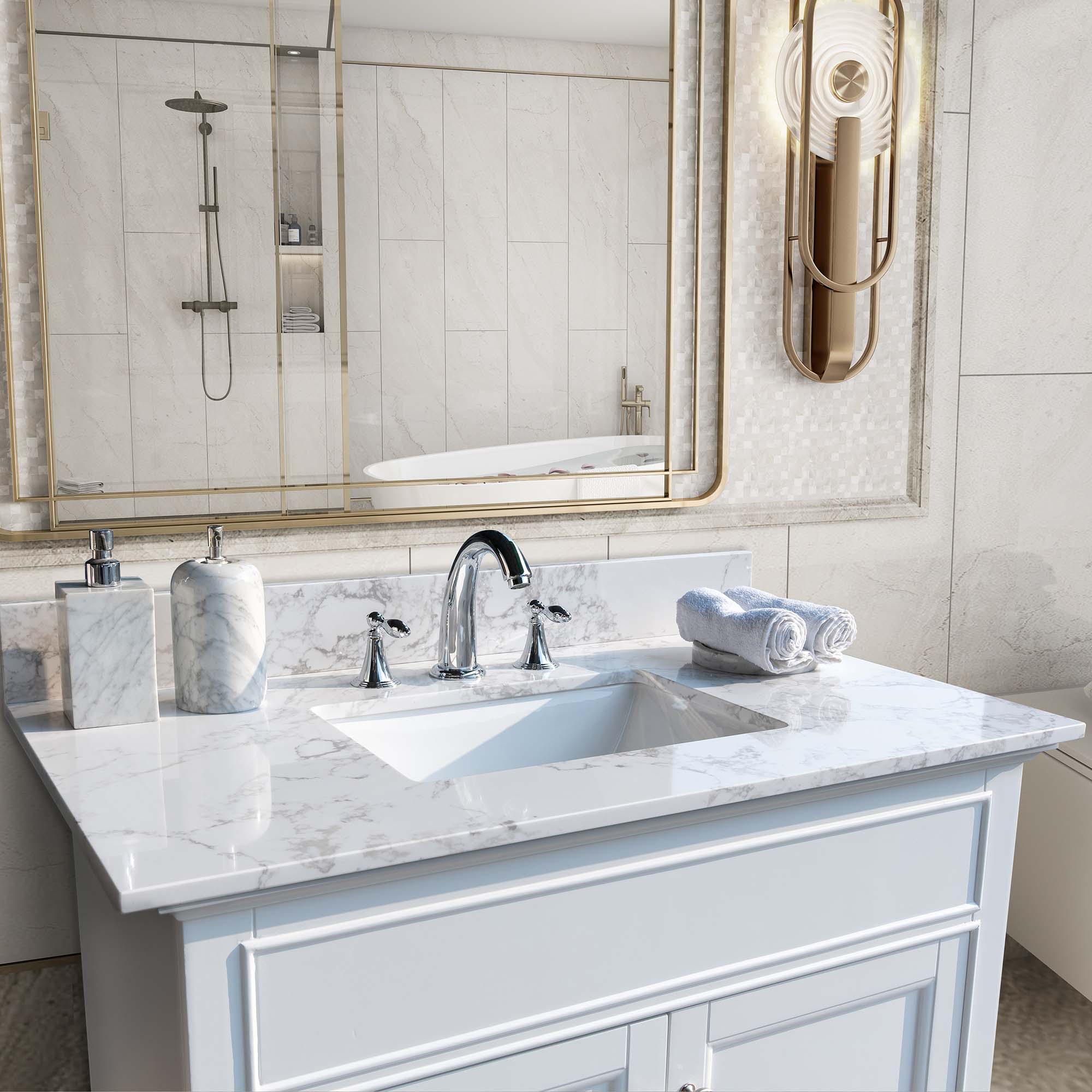 Montary 37inch bathroom vanity top stone carrara white new style tops with rectangle undermount ceramic sink and back splash for bathrom cabinet