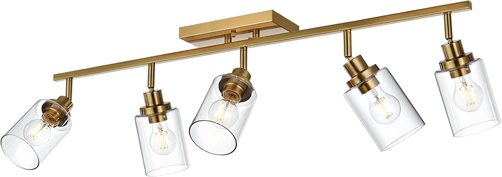 MELUCEE 5-Light Track Lighting Kit Brass Semi Flush Mount Ceiling Light Fixture with 5 Rotatable Light Heads, Modern Accent Lighting for Foyer Art Wall Kitchen, Clear Glass Shade
