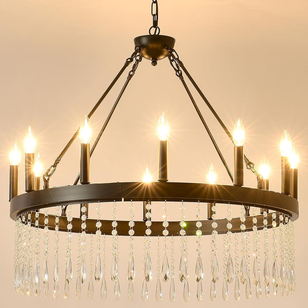 32 inch Black Wagon Wheel Chandelier Farmhouse,12-Light Round Outdoor Wheel Chandelier for Porch Living Room Light Fixture for Entryway Dining Room high Ceilings Foyer (Black 32 inch 12 Light Crystal)