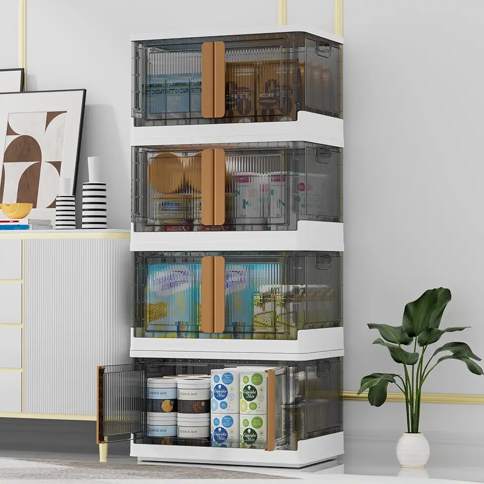 4 Packs 19Gal Plastic Storage Bins for Closet Organizers and Storage, Folding Storage Box, Stackable Storage Bins with Open Front Door, Storage Bins with Wheels
