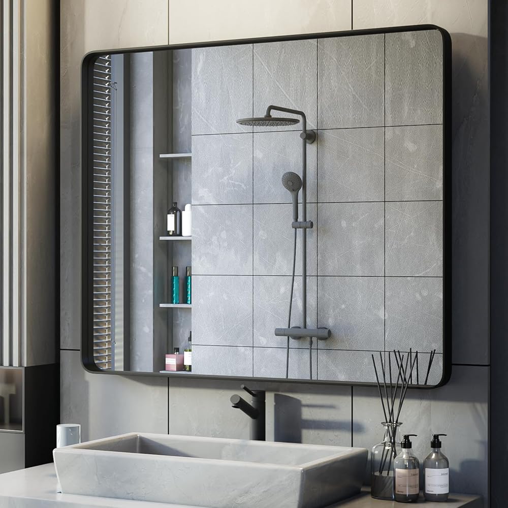 Yamazakura Black Bathroom Mirror for Wall, 36x30 Inch Matte Black Framed Bathroom Vanity Mirror for Farmhouse Living Room Bedroom, Anti-Rust, Tempered Glass, Rounded Corner, Horizontal/Vertical