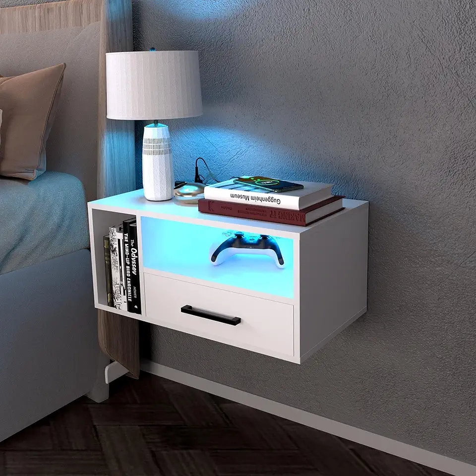 Nightstand with Charging Station and LED Light Strips, 21.3" Table with Drawers,Floating Bedside with USB Ports and Outlets, Bedroom Furniture, White