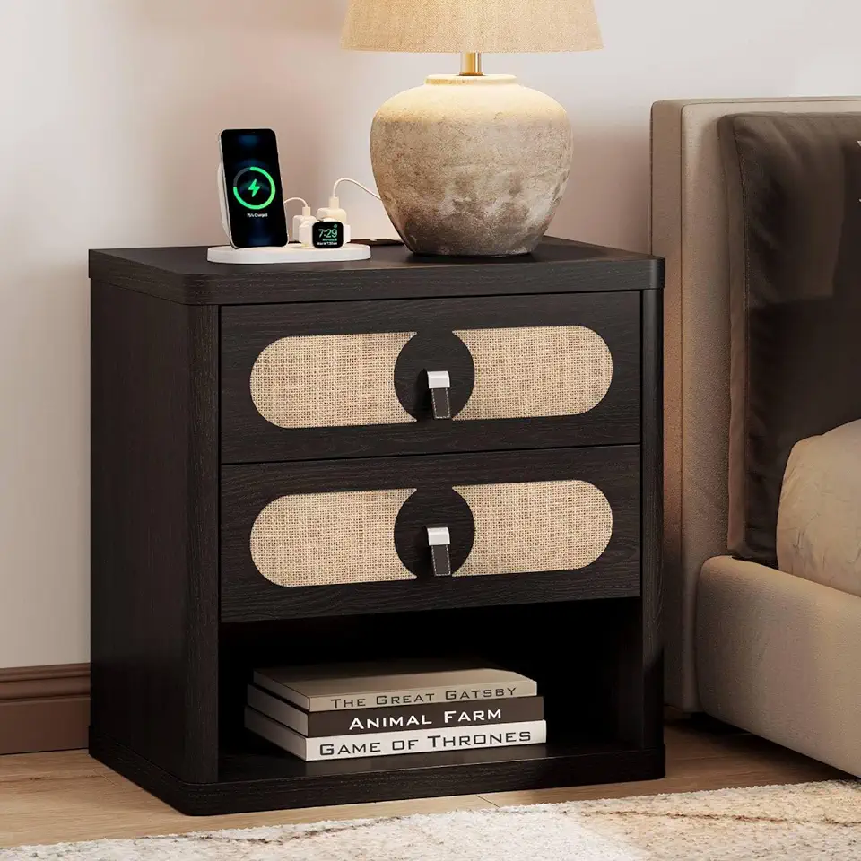 SICOTAS Black Night Stand with Charging Station and USB-C Port, 24" Large Nightstand with 2 Natural Linen Drawers, Tall Bed Side End Table with Open Storage for Bedroom